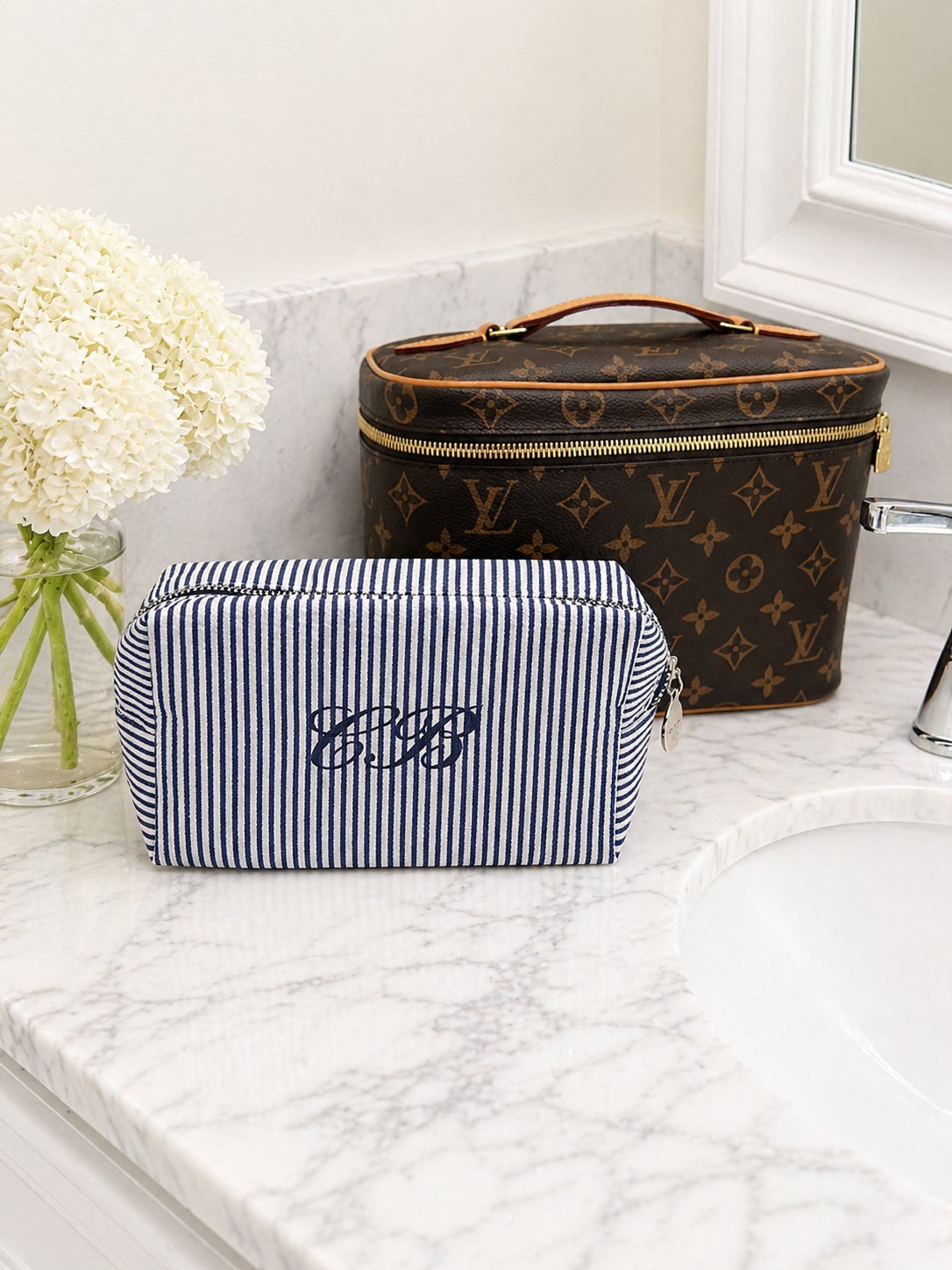 Navy Seersucker Monogram Toiletry Cosmetic Bag