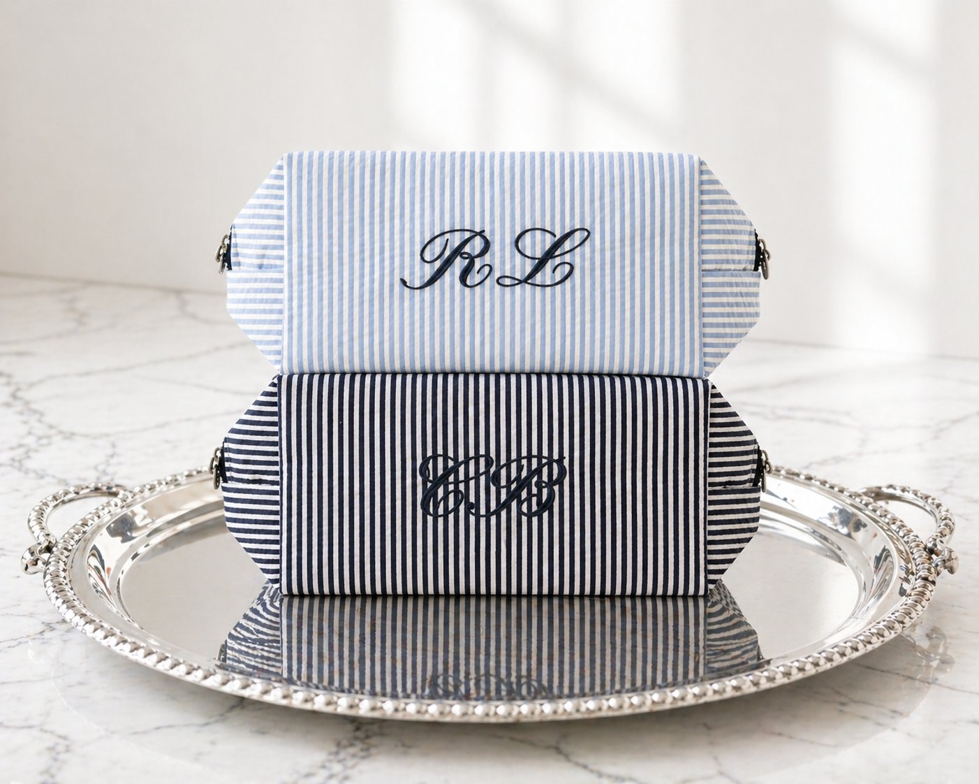 Chic, classic, and designed for everyday elegance, our personalized seersucker cosmetic bag is the perfect blend of style and function. Featuring a timeless seersucker exterior, silver hardware, and a wipeable coated interior, this piece is ideal for travel, daily essentials, or displaying beautifully on your vanity.