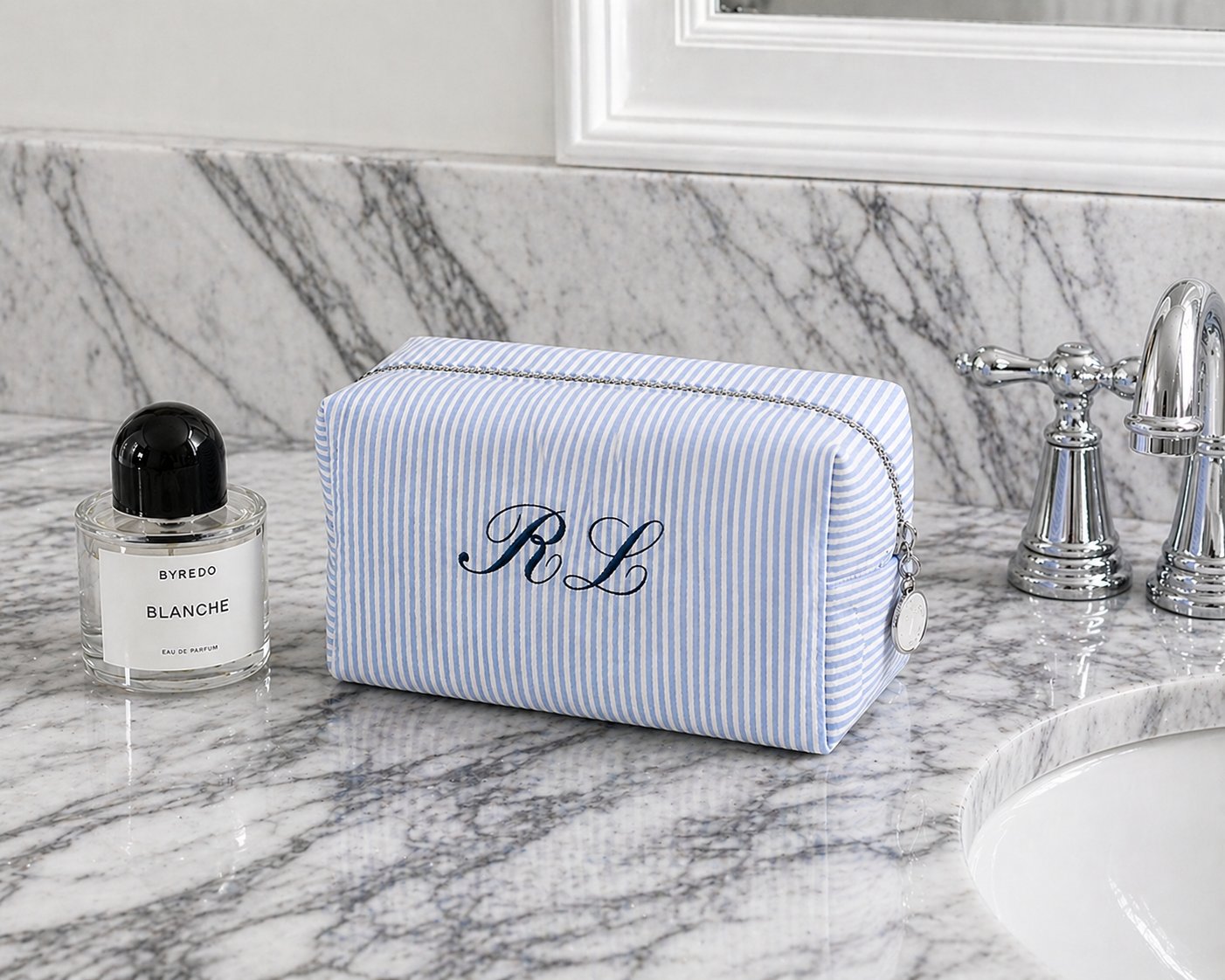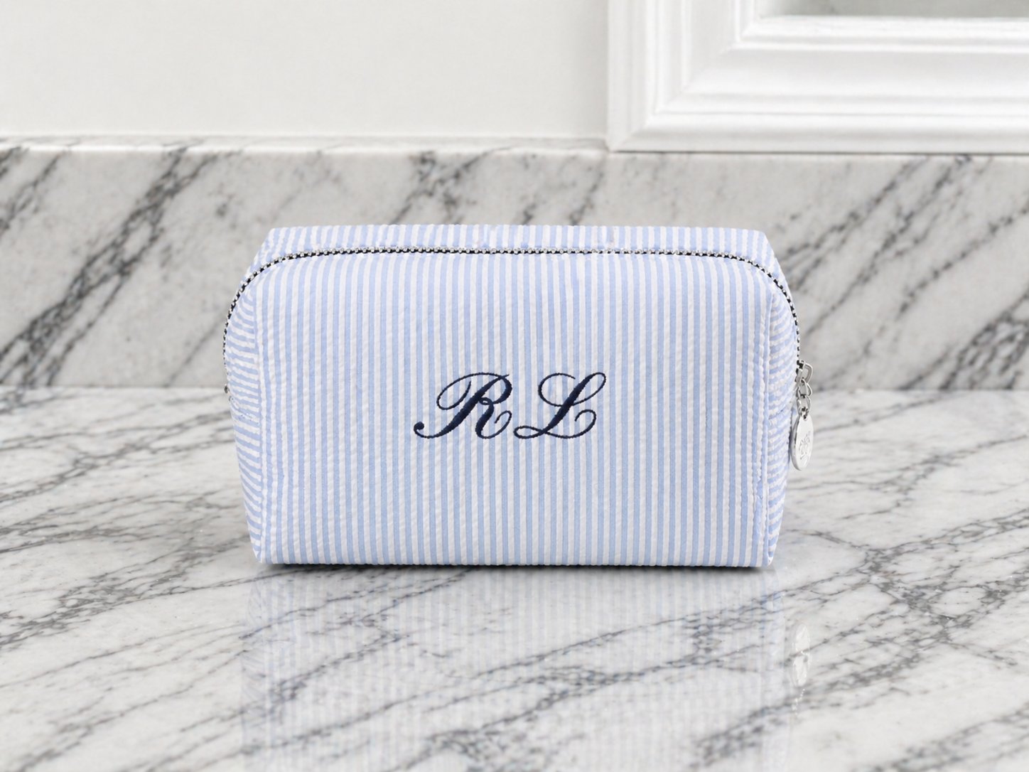 Chic, classic, and designed for everyday elegance, our personalized seersucker cosmetic bag is the perfect blend of style and function. Featuring a timeless seersucker exterior, silver hardware, and a wipeable coated interior, this piece is ideal for travel, daily essentials, or displaying beautifully on your vanity.